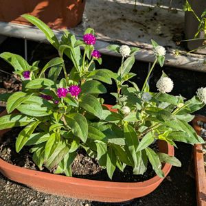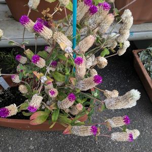 センニチコウ ミッテ😍 モニター品が届いてから2ヶ月経ちました✌️ 朝日の出る方向に向いてきたから、反対向きにすれば真ん中に戻るかと思い位置変更😅 花の下部が少しずつ枯れて来ました😂 切ってドライにしている方もあったようです💞