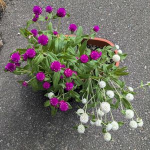 モニター育成中のセンニチコウ ミッテ😍 昨夜の大雨で白い花の株が倒れてます😱 雨も風も強かったのがよく分かります😅 家の中に居ると殆ど気付かず🤣
