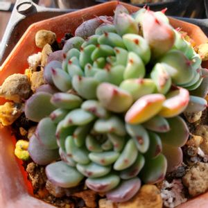 小さな子株が密集してきたミニマの群生株。小さな爪先が一斉にピンクになった。 葉はまだほとんどが緑のままだけど,夏よりも淡い色になって爪との調和が保たれている。