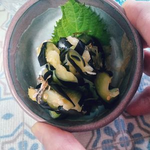 本日、連投になります🙏 【本日の1品】 ナスの塩もみ ただナスを切って塩でもんだだけの1品🍆 これもそぼくだが、酒のつまみに良い✌️ママが愛情持ってモミモミした1品です💕そしてキンキンに冷えた冷酒のおちょこに小さな大葉を浮かせて飲みました。
