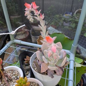 今日は実家多肉デーでした☺️ 夕方は建物の陰になり、だいぶ涼しい気がする玄関前の寄せ植えです♪ 一番大きな子は冬美人さん✨ 夏でも美人さんです💕 殆ど雨がなく水切り状態が続き、夏なのに紅葉がさめて無い子が💦 明日からの酷暑で焦げそうなので、ホムセンで購入した、Xエナジー入りのお水で水やりしました✨ おひとり様鉢は時短底面給水です! pic2 寄せ植えを別の角度から☺️ 桜吹雪は濃いピンクで綺麗だけど、この鉢では蕾が出ませんでした💦 pic3 下の段では姫秀麗さんもワテルメイエリーさんもほんのり色🩷 pic4 噴水のような花芽の親子さんはシャビアナの誰かさん✨ お母さんの花芽はカットしました✂️ pic5 他にも噴水花芽を出している子を発見💡 リジョイスさんです♪ この子は丈夫だし夏も綺麗な色のままなので、とても目立ちます💕 Xエナジーは今年初めて使用した活力剤なので、効果はどうなのか? この先が楽しみです😊 自宅ベランダの子たちは先週までにあげました🥤 名前がいかにも強そうです🤪 🏷️金曜日の蕾たち 参加させていただきます✨