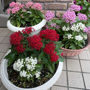 今晩は🌟 夕方のお花さん達です♪ ペンタスさんが勢揃いしました😊 ピンクと白は生育が緩やかだったのでやっと咲きました🌸