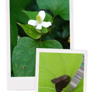 朝方、夕顔の葉っぱ🌿の上でひと休み?編笠ハゴロモ😳 虫 嫌だな〜☹️という方のために、どくだみの可愛らしいお花と爽やかグリーン🍃で毒消しなさって下さいまし🙂↕️