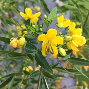黄色の鮮やかな花木です。いま10月に咲いてます。花には大きな蜂が一杯集まってくることもあります。確かアフリカ原産だったような。お願いします