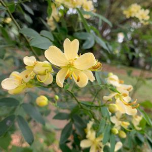 クリーム色が優しいお花に出逢いました🎶🌼🌼🌼 お名前がわかりません😊 どなたかお分かりになりますかー💕 宜しくお願いいたします☺️ お名前を早速ご連絡いただき、[アンデスの乙女]と分かりました❣️ すみれさん、ありがとうございます✨( ◠‿◠ )V マメ科 センナ属 和名 ハナセンナ 駒沢公園にて