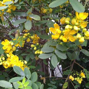 「アンデスの乙女」という名前です💛 樹高が 1~2mぐらい くす玉みたいな蕾🎊 小さな黄色の花が 咲いています🎊 💛💛💛💛💛💛💛💛 マメ科で 花の後 マメの鞘が いっぱいできます。 💚💚💚💚💚💚💚💚