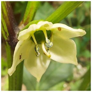 咲きかけの ミニパプリカの花 &糸トンボ (*˘︶˘*).。*♡🤍💚