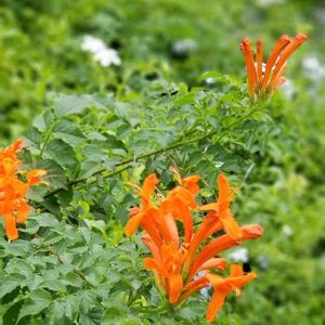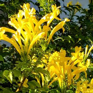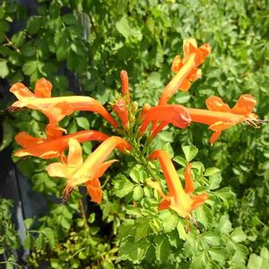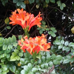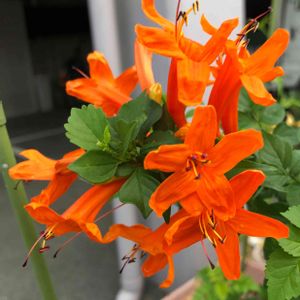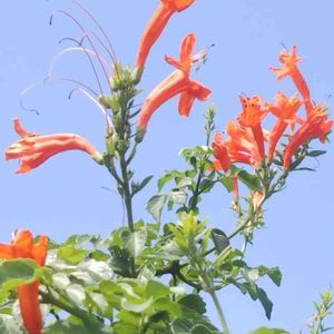 ヒメノウゼンカズラ(姫凌霄花) 南アフリカ原産の半蔓性の樹木で、よく見かけるノウゼンカズラに近い仲間です。 花期は夏から秋にかけて咲きますが、秋によく花を咲かせます。花色は橙色や黄色で園芸品種のアウレア(Aurea)というのもあり、筒状に長い花が集まった花序を作ります。 訪ねる度 咲いている気がします。