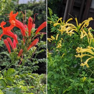 散歩中に出会った花 ヒメノウゼンカズラの 朱❤️と黄💛 ググってみたら、学名等は色の違いで名前も違うんですね~ ❤️はテコマリア・カペンシス別名ケープハニーサックル 💛はテコマリア・カペンシス・オーレア 別名イエローケープ・ハニーサックル 🏷月曜はビタミンカラー