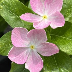 ニチニチソウ 『薄化粧』 (園芸店) 園芸店に寄ったら、可愛らしいピンクの絞りのニチニチソウが😍💗 以前投稿した時は、ぼんやりとした色合いでしたが、こんな可愛い色に色変しちゃうなんて🎶 思わずパチリしてしまいました😆