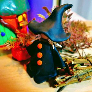 色付き焼き粘土で ハロウィン用の魔女と魔女ハウスを作ってみました~ 魔女ハウスはセリアで買った100円のジャム瓶にペタペタと粘土をはりつけしました。 中にはティーライトが入ります。