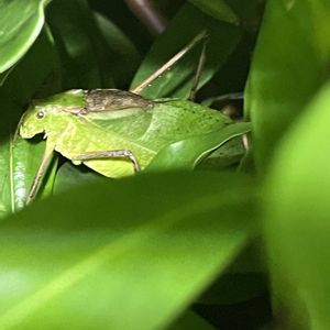 「ガシャガシャガシャ!」?「ガシャガシャガシャ!」?何の鳴き声かな? いましたー!沈丁花の葉の間にクツワムシ。