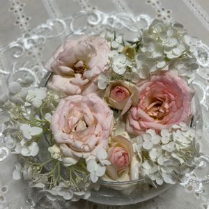 🌸 花手水 🌸 続く強風暴雨で被害に…😭 優しい色合いでテーブルが 華やいだよ🌹