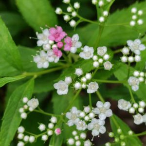 シモツケ バラ科シモツケ属 落葉低木 北海道、本州、四国、九州に分布 海岸から山地までの日当たりの良い草地に生える。 枝先に複散房花序に多数の花を付ける。 花の直径は3〜6mm、花弁は5個で楕円形~広楕円形で、長さ2.5〜3mm、幅1.5〜3mm。 雄しべは25〜30個で花弁より長い。 雌しべは5個。 花柱は無毛で長さ1〜1.5mmである。