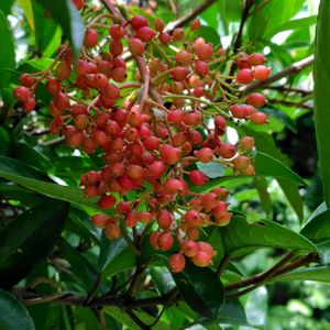 サンゴジュ ガマズミ科ガマズミ属 常緑高木 本州関東地方南部以西の海岸寄り、 東海地方南部の海岸寄り、四国、九州、沖縄までに自然分布。 名前のとおり、珊瑚に見立てられて赤い実が付き、庭木、生垣、防風、防火樹に利用される。 花期6〜7月で大型の円錐花序で小さな白い花を多数付ける。(⑤ 6/12撮影) 果実は液果で、長さ7〜8mmの実を赤い果柄の先端に多数付ける。(① 8/16撮影) 赤い実ができる頃には花序(果序)も赤くなっている。 はじめは鮮やかな赤色だが、 9〜11月ごろに熟すと次第に黒ずんで青黒色に変わる。 ④(8/16)⑤(6/12)は同じ木を撮影しています。 🏷️木曜日は木 🏷️木曜日は木の実 に参加させていただきます。