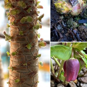 みんな待ち遠しい〜✨ 福寿草の黄色が見えてきた蕾 クリスマスローズの開き始めた花 黒法師の育ってきた新芽