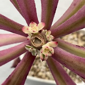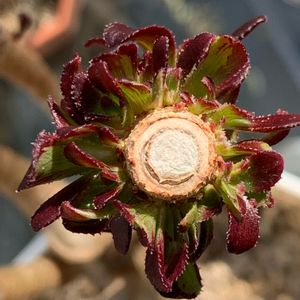 え?😳 アエオニウム ガーネット 花が咲いたので、花茎を切って再生を促し中のハズが‼️ これってまた蕾が出る形状では?😂 同じくらいのサイズで一緒にお迎えした水蜜桃の今と違いすぎる〜💦(2枚目)