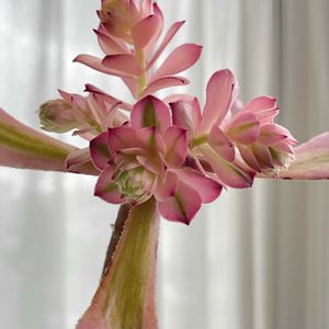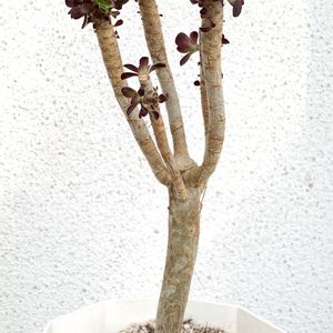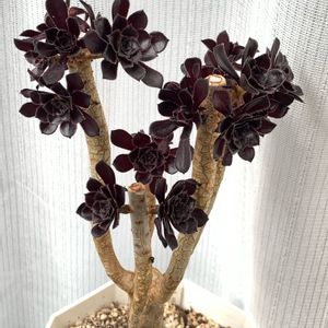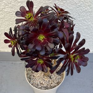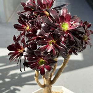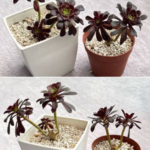 アエオニウム ガーネット 花後の枯れが怖くてカットしました😅遅いかな? 芽が出ますように🙏✨️ まだ蕾があるので花茎は花瓶にさしておきます 植え替えた途端に予想外の長く伸びた株💦 もう倒れてしまうので押さえが必要でした