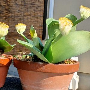 10~11月頃に 成長点から 花茎を伸ばし 先端に無数の糸状 の雄蕊が集まった白色の花を付ける 刷毛(はけ)のようなふさふさの花 🌿葉は多肉質でぶっとい🎶 (2年前にこの大鉢を頂きました) 眉刷毛万年青(まゆはけおもと) 別名 ハエマンサス ヒガンバナ科