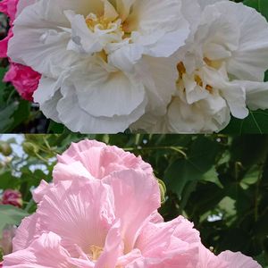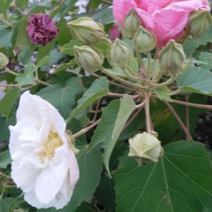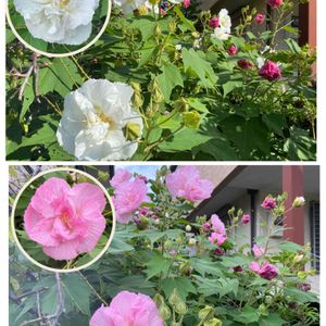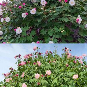 🌸酔芙蓉(スイフヨウ)🌸 一重・八重・薬玉 咲き 揃えてみました🥰 特に八重咲きで花びらがピンクと白に色変わりしている(くす玉先き) "七面芙蓉"は 酔芙蓉の中の女王様👸ですねー💘💕