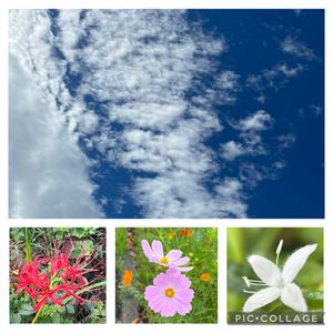 秋の空 今日はお墓参りに行ってきました☺️ ヒガンバナ コスモス メリケンムグラ