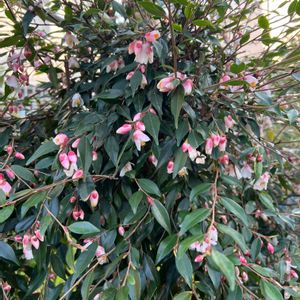 カメリア エリナカスケード 別名 姫サザンカ 複数枚投稿 5枚 スライドしてね 遅咲きの小さな花 細い枝をしならせて咲くタイプだけど、コンパクトな樹形に剪定されている。