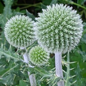 こんばんは。◕‿◕。 エキノプス·アークティックグロー💕 真ん丸で可愛い🎶 昨年、見切り品で税込み50円だったので駄目元で3ポット購入しました。 雪解け後、みるみる葉が伸びて蕾も沢山付きました。 ルリダマアザミの様に紫の花が咲くのかと思ったら、白い花らしいです。 ドライフラワーにもなるようなので、試してみようかな。