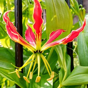 グロリオサの1輪目が開花しました🙌 昨年、購入し数輪 咲いたのですが…、🍀花友さんより 立派な球根を頂ける事になり、その大きさの差にも驚きました😄 ②⬆️今朝、早朝 ⬇️昨日の様子 まだまだ蕾がスタンバイ👌 暑さで気持ちもパワーダウン⤵️ですがやはり元気もらえますね〜🤲❣️❣️❣️