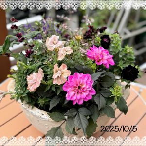 今日の1鉢。 ダリアに一目惚れして使ってみました。 ベロニカ、気温が下がってくると葉の色が紫になるとのこと。 楽しみです。 暑さもひと段落してきたから花も長持ちしそうです。 #ダリア テンプテーション #ペチュニアジュリエット ブラック #ペチュニアジュリエット 桜モダン #ベロニカ グレース #アルテルナンテラ ポリゲンス #ユーフォルビア ピンクフロスト #寄せ植え #bot