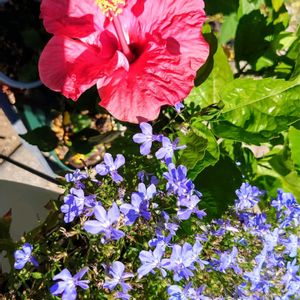 切り戻した ペチュニアさんたちが 再生して 可愛く咲いてます なぜ出てきたのか不明な ピコロールも元気です(#^.^#) ハイビさんたちが 暑くて不調ながらも 頑張って咲いてます(*^。^*)✌