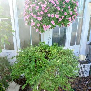【PW 2025新作 スーパーチュニア シルキーピンク 吊り下げハンギング】 これは 前回の投稿のシルキーピンクの吊り下げハンギングの方です。 同時進行で2つのシルキーピンクを育成してまして こちらは台風対策で1週間以上 吊り下げから下ろしてガーデン用の丸テーブルの上で避難育成してたら テーブルに沿って横に伸びた…😵 本当に成長が早いので 変にテーブル癖がついてしまいましたが そのうち重力で丸くなると思う…🤔?ワカラン 暫し様子を見て駄目なら切り戻しかな😓