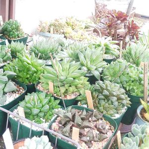 多肉植物ビスタさんで購入しました♥️ センペルビウムの季節なんでついつい… おまけは右手前のセンペルビウム。ジャンヌダルクでした♥️ ハオルチア 青いサンマ だけ砂かぶりでした😂