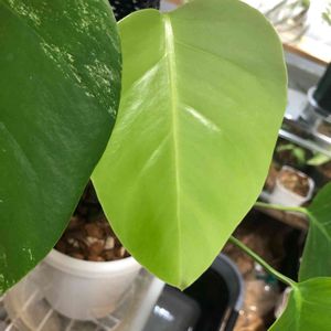 困りました。 葉緑素がまったくない葉が展開。 アイコンにしている『アロカシア グリーンベルベット バリエガータ』純白の葉っぱが出てしまいました。通称『お化け』と呼ばれます。 葉緑素がないため、光合成ができません。そのため他の葉っぱがなくなれば、株が枯れるリスクがあります😢 葉緑素がある葉っぱは、残り1枚。この葉っぱが枯れる前に新しい正常な葉が出れば良いのですが。