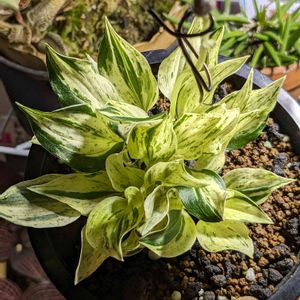 マリンの子株育ってます ⭕のような斑を私は勝手に霜降り斑と呼んでいます 斑は強い方が美しいんだけど… 糊斑ではないタダの派手斑はオバケになりやすいので怖いです👻 霜降り斑は安定して育つし品があって好きです!