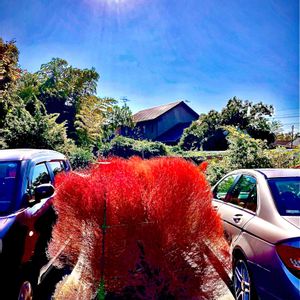 🌳コキアのある風景🌳 逆光の中で☀️ 大きなコキア 真っ赤に色づいて 庭を彩っています♪