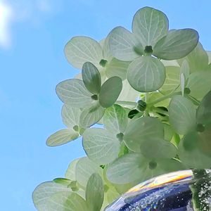 予報ではまだ降るみたいだけど… 雨上がりの青空がキレイな朝です 雨で折れたピラミッドアジサイ 2枝 シュワシュワ花器と 青いグラスに