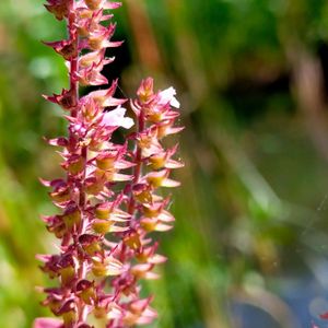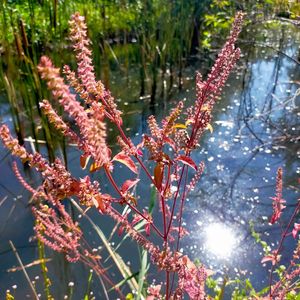 おはようございます、今週もよろしくお願い致します😊🌄 まこSさんの 🏷月曜日は元気色の花 池のピンク色の花が綺麗です、タコノアシと思ったのですが、イヌコウジュの花後の紅葉だったようです🍁🍂 バックはヒメガマです。
