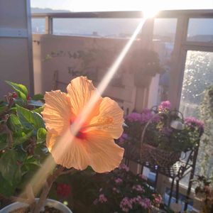 6月5日に一番花が咲き、7月頃からはほぼ毎日咲いていたハイビスカス🌺 10月末頃、大きな花が3輪華やかに咲いた後ほぼ咲かなくなり✨ 11月3日に強剪定しましたが、花びらが見えている蕾が一つだけあったので残しておきました。 その蕾がようやく開花😊 朝7時頃、写真を撮ったらちょうど朝日が🌅 今年最後のハイビスカス、大きくて形もとても綺麗でした😊🌺 来年もたくさん咲いてくれますように!