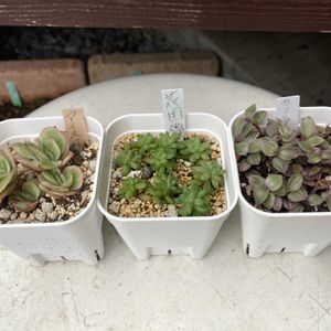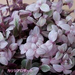 お迎え記録です。 my gardenさんから譲っていただいて、今まで我が家になかったものを紹介します。 左から…アイスローズ、花団錦、カリシアロザート ★写真2枚目 「アイスローズ」 ちょっとユニークな葉の形をしていますよね。 調べたところ、韓国苗の「アイスラブリーローズ」「アイスローズ錦」「ラブリーローズ錦」という名前で出回っているものと同じかな?と思います。 ただの「アイスローズ」という名前の普通のロゼットのエケベリアは、別にあるようです。 たぶんエケベリア?とmy gardenさんは言っていましたが、もしこれがラブリーローズの斑入り種なら、グラプトベリアかもしれませんね。 ★写真3枚目 「花団錦」 はなだんにしき と読むようです。 調べてみたら「レッドベリーhyb」(レッドベリーと何かの交配種)と同じものらしいです。 淡い黄緑が地の色で、ほんのりピンクに紅葉するようですね。 レッドベリーのように赤くならないみたいです。 今は真緑ですが、寒くなるとピンクになってくれるでしょうか…? ★写真4枚目 「カリシアロザート」 カリシアはツユクサ科です。寒さに弱く、室内で越冬させたほうがいいようです。 以前、アメジストセージさんからいただいた「カリシアレペンス(桜色カリシア)」は2年続けて越冬に失敗して以来育ててなくて、ちょっと自信ないのですが… うまく冬越しできるかチャレンジですね~。 カリシアロザートとカリシアレペンスは別種と聞いていましたが、改めて調べたら 「カリシアロザートは、カリシアレペンス(原種)から作出された園芸品種」なんだそうです。 my gardenさん、いろいろ珍しい種類をありがとうございました~。