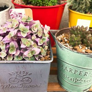 こんばんは😃🌃 …まりチッチ迷走中😓 そんな寄せ植えでございます(笑) 私の家の食卓には飴ちゃんと ちょっとしたゴミを捨てる為の新聞広告で折った 小物入れ?のストックがあります。 『B・B・Aっぽいね😥』 …とか、思ったの誰⁉️(笑) このドロップ缶もしばらくあったのですが 誰も手をつけず、数ヶ月前に賞味期限を迎え 次男が『お母さん‼️賞味期限切れてるよ‼️』 …とうるさいので ほにゃららして(あえて書かない💦) 缶切りで開けて… なんとなく夕方、ガバッと昼寝から起きて 🦟に刺されながら寄せ植えてみましたが なにやら方向性がハッキリしませんね😑 それは、彩りが悪くてテンションが上がらないから⤵️⤵️ きっと夏のせい‼️ そして懺悔します😓 私、以前、織家さんからいただきました 『桜色カリシア』枯らしてしまいました🙇♀️💦 ごめんなさい🙇♀️💦💦 他の多肉はなんとか育っていますが 桜色カリシアは、なかなか上手くいかず… そして、カリシアを何度か見かけるようになり またチャレンジしよう‼️と 思った訳です。 今度は過保護に育てようかな? やっぱり迷走中😓