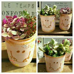 おはようございます✨ 今朝はサブイサブイ〰💦 柄にもない乙女チックなリメ缶💗作ったので😁植えてみました😊 頂いたカリシア・ロザートをメインに、ビレアグロボーサとウェデルマニーをカット✂して挿し挿し😃 3種とも寒さに弱いので~一緒が良いよね💕