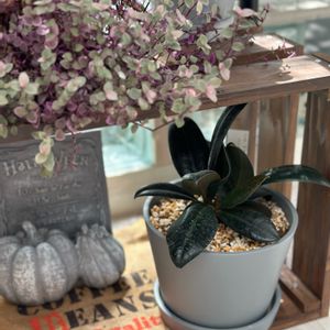 ガーデンルームの中 何年か前にdiyしたキャベツBOXの中 でひっそりハロウィン🎃 カリシアロザート フィカスバーガンディー(黒ゴムの木)