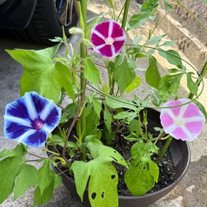 アサガオが2色同時に咲いてくれました✨ あとローズ色も咲いてくれれば3色揃います😊 いつ揃うか楽しみです💕