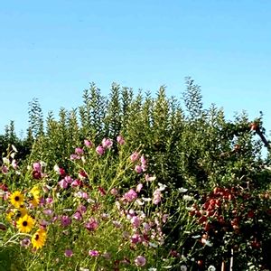こんばんは 秋 リンゴの収穫時です🍎🍎🍎🍎 コスモスとひまわり🌻🌸たくさん 咲いて賑やかなガーデンです ご近所のガーデンカフェにお出かけ リンゴも真っ赤久です 青空も素敵 気持ちの良い休日です☕️