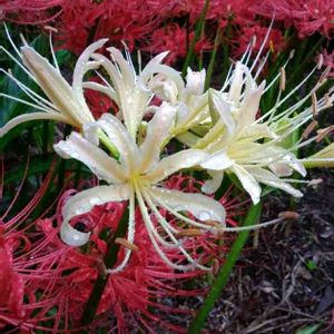 一本だけシリーズ① 一本だけ白─💟 リコリス(彼岸花)…アルビフローラ 木瓜さん→もんもんチャン→Kiimiチャン→だあれ⁉️ 続くかしら⤴️👀