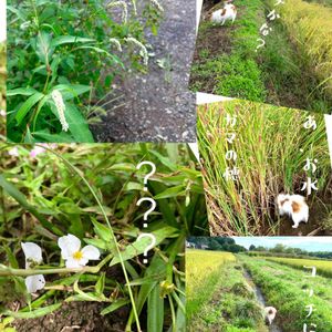 こんな感じの田んぼ道で白露草みつけました。シロイヌタデも可愛かった〜🥰 田んぼになんともなんとも可愛い〜〜い白花と、ピンク花がありビックリ!! ワンコは田んぼ引き入れ用?の水路、小川?でお水飲もうとガマの所やら行っちゃいました😅 追記 調べました 白/オモダカ ピンク/イボクサ