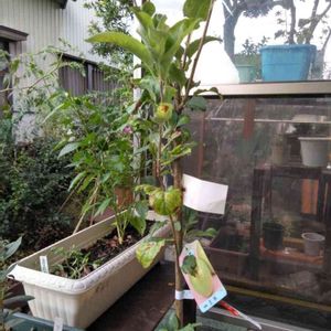 以前 種から大きくなったリンゴの相棒を買ってきました! 違う種類じゃないと実がならないからね。 このリンゴは980円。 是非とも 実を結んで欲しい!