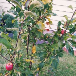 アルプス乙女の収穫です 直径4~5cm程の小さなリンゴです まだ株が小さいので2つしか実ができませんでした