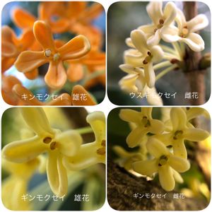 キンモクセイは日本には雄木しかなくギンモクセイは雌雄どちらもあり そしてウスギモクセイとギンモクセイの違いは? 以前ウスギモクセイと思っていたものが実はこの度ギンモクセイとわかりました。 ギンモクセイとウスギモクセイ違いは何? 正しいかわからないのですがある所にギンモクセイとウスギモクセイは同一の学名で ウスギモクセイは栽培品種園芸種品種といい事になったとありました。それでやっと納得しました。 この度投稿の為4つを比べてみるとウスギモクセイはやはり少し違う色のように見え又々迷ってしまいました。(^◇^;) キンモクセイの名前の由来は原種のギンモクセイが白い花を付けるのに対してキンモクセイは金色(オレンジ)の花を付けるから とのこと。