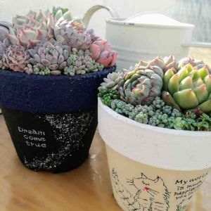 こんばんは〜❣️ 今日はお仕事行ってきました! 昨日、チビげんちゃんとのラブラブDAYはお昼寝なしと言う結果でしたが おしゃべりしながら少しだけ リメ鉢作ったり 植え替えしたりの多肉事出来ました。 チビ幻楽さんとホワイトゴーストさんは ずっと前に芝山のイベントで購入した鉢にIN! 真ん中のまちゃごろーさんの鉢はインスタの販売会でゲットさせてもらいました🌼🌼🌼 可愛すぎて♥まだ土を入れられていません💦 もっと上手に寄せ植え出来たらなぁと思うけど… 宝物でいっぱい⤴︎︎︎⤴︎︎⤴︎︎︎ いつもありがとうございます😆✌